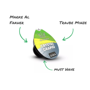 - Al Fakher Crystal Grapio Ooka Pod – Der Klassiker mit Menthol-Traube mit einer besonderen Note, einer der meistgefragten Pods.